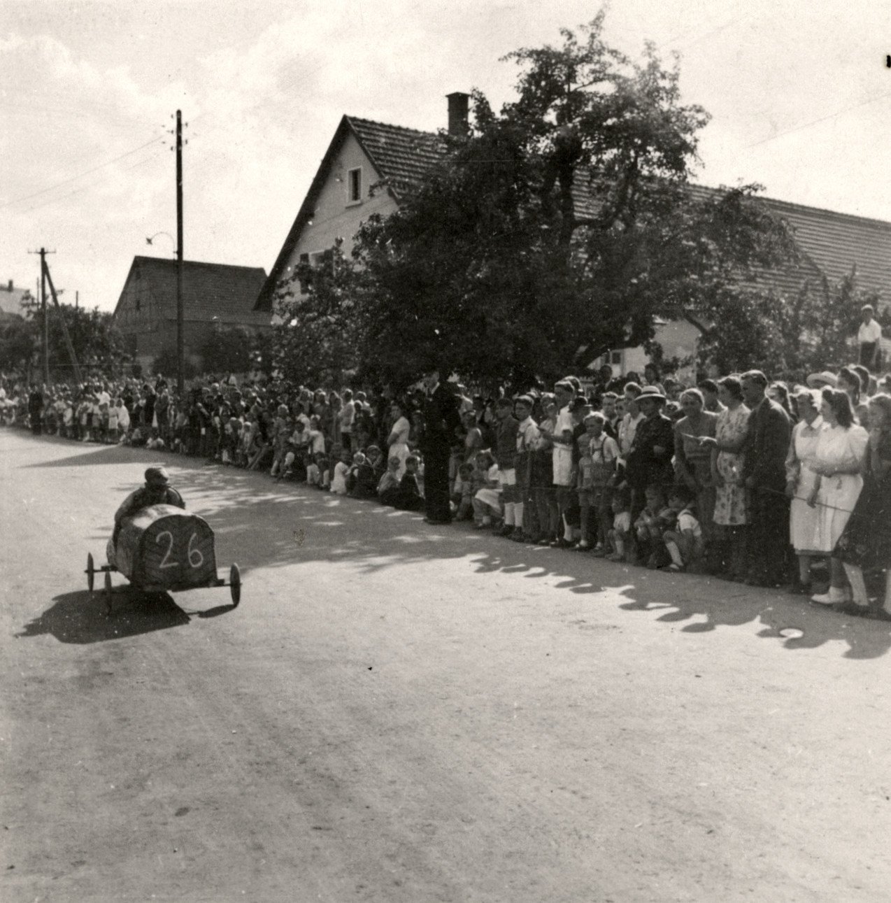 Links die Reichstadtgarage mit Tankstelle und mittíg Elektrogeschäft Zaiss mit Volksbankfiliale(Haus 41+43), links des weißen Autos(Haus 45+47) womöglich eine Filiale der Sparkasse, weiter rechts Gärtnerei Freymüller.