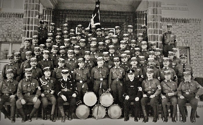 Die örtlichen Parteimitglieder der NSDAP zum Gruppenfoto vor dem Westeingang der Bergschule. Anlass war vermutlich ein Feiertag. Die damalige Bartmode war eindeutig...